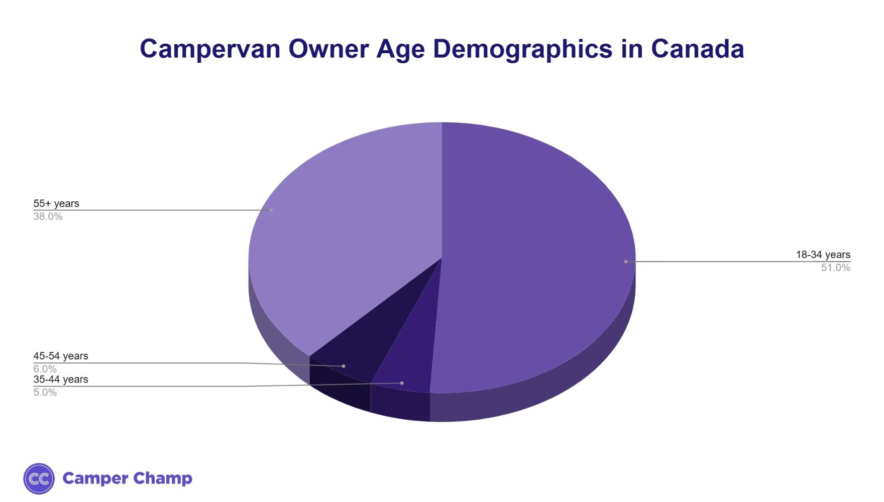 - Age Distribution: Class B campervan owners are bimodal with 51% in the 18-34 age range, 5% in 35-44, 6% in 45-54, and 38% in 55+.