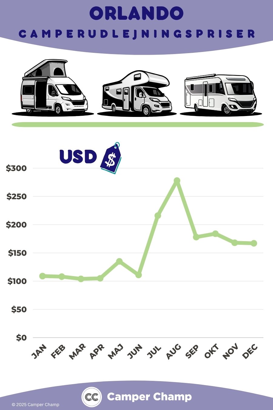 Prisen for at leje en autocamper i Orlando starter på omkring $110/dag for kompakte modeller og kan stige til $260/dag eller mere for større køretøjer.