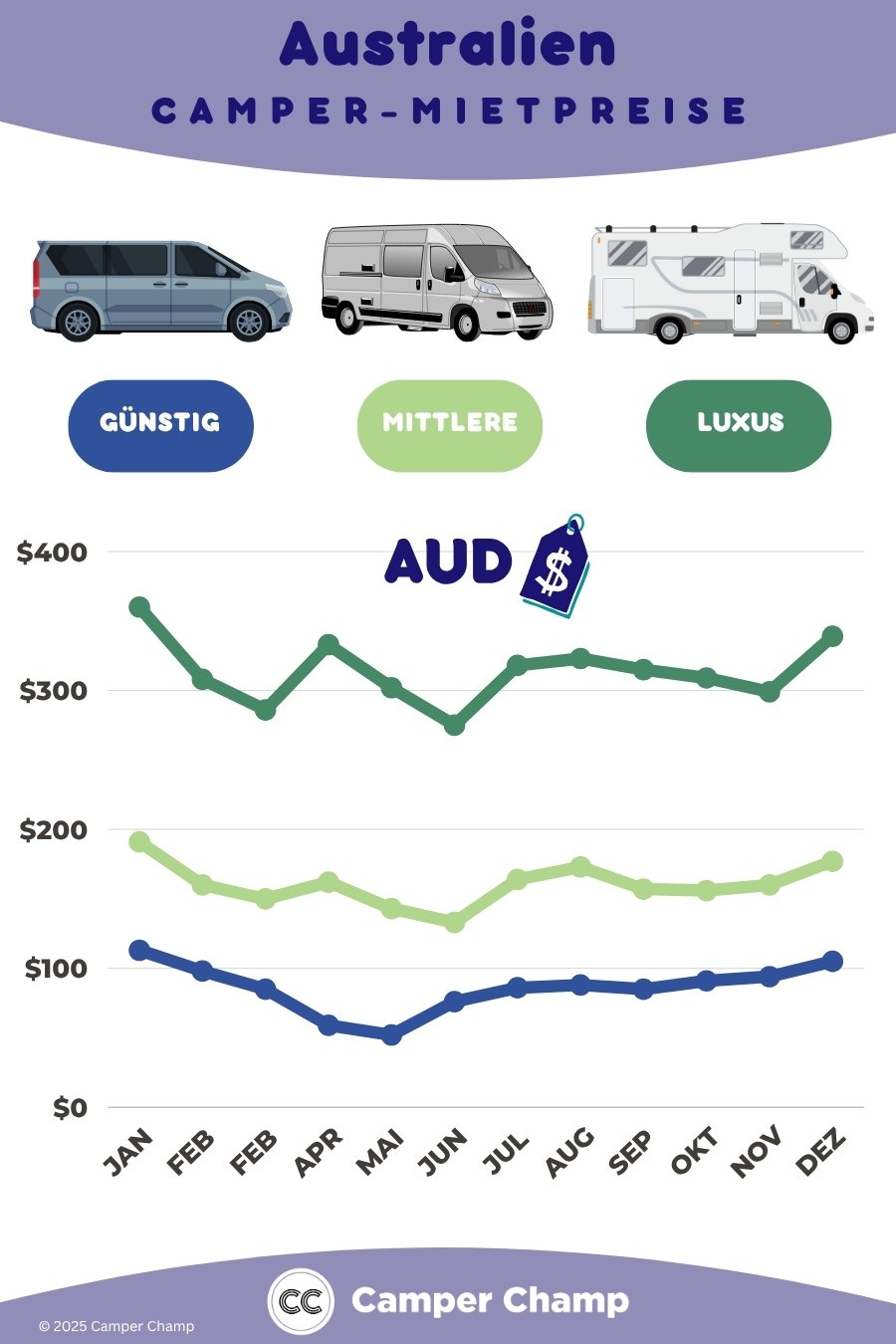 Die Mietkosten für Campervans in Australien liegen in der Regel zwischen 40 und 500 $ pro Tag, abhängig vom Fahrzeugtyp und Ihren Reisedaten.