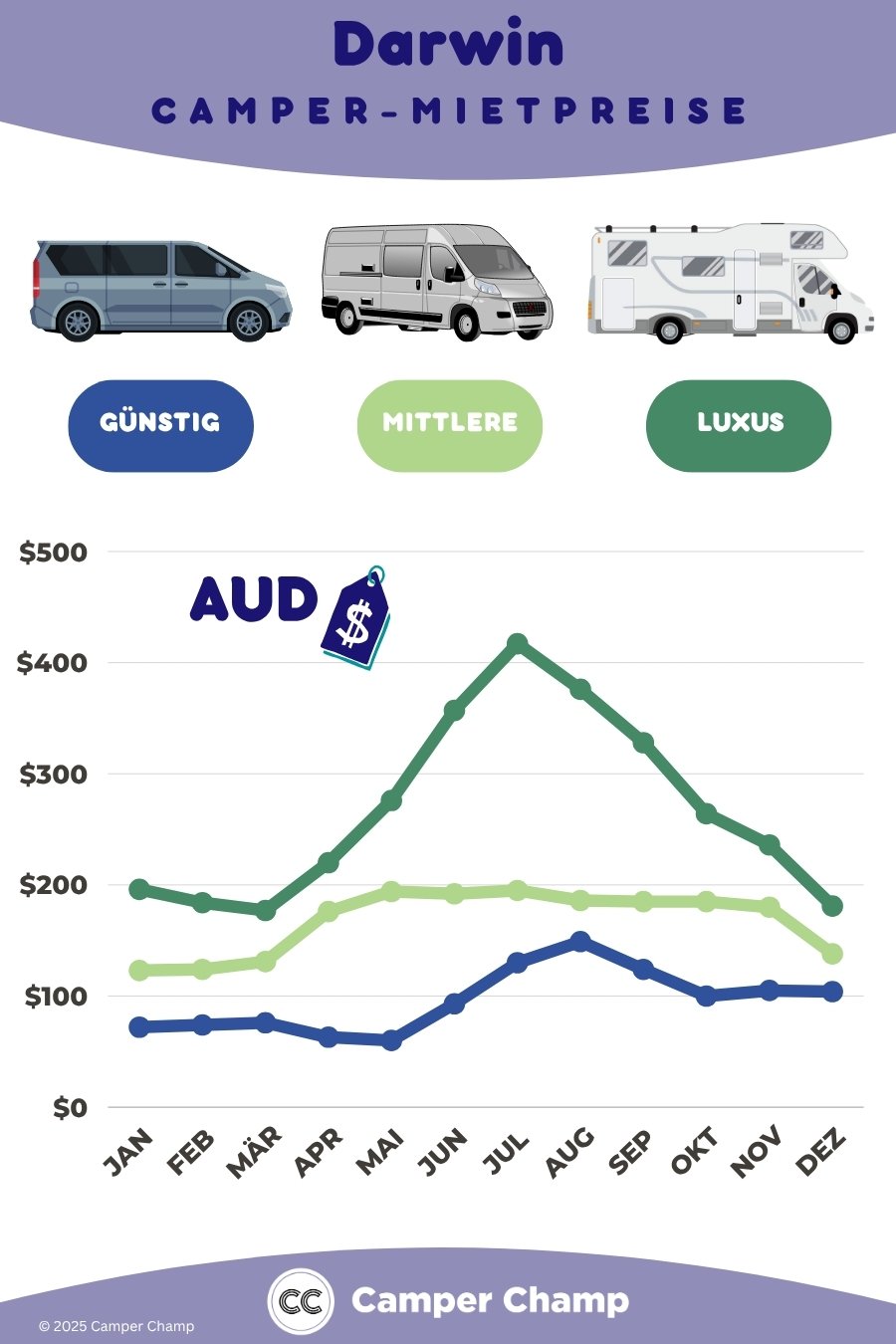 Die Tagesrate für die Anmietung eines Wohnmobils in Darwin schwankt zwischen 60 $ und 420 $ pro Tag für die meisten Wohnmobile. Die Preise hängen größtenteils vom Fahrzeugmodell, der Mietdauer und der Reisesaison ab. Das Fahrzeugangebot umfasst kleinere Fahrzeuge wie den Cheapa HiTop und größere Modelle wie den Maui Beach Elite.