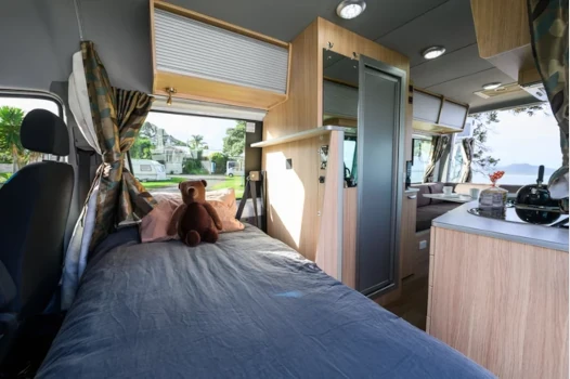 The Britz Venturer Plus is designed for a small family. It includes both a double and a single bed. The single bed is smaller, making this an ideal choice for two adults and a child.