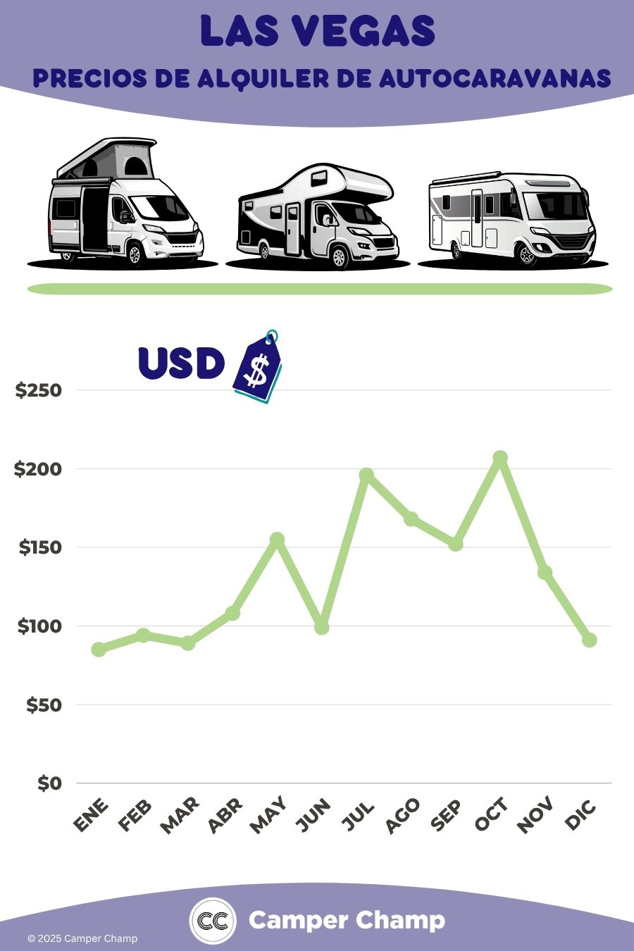 Los precios de las autocaravanas de alquiler en Las Vegas pueden oscilar entre los 50-370 $/día, dependiendo del tipo de vehículo y su disponibilidad.