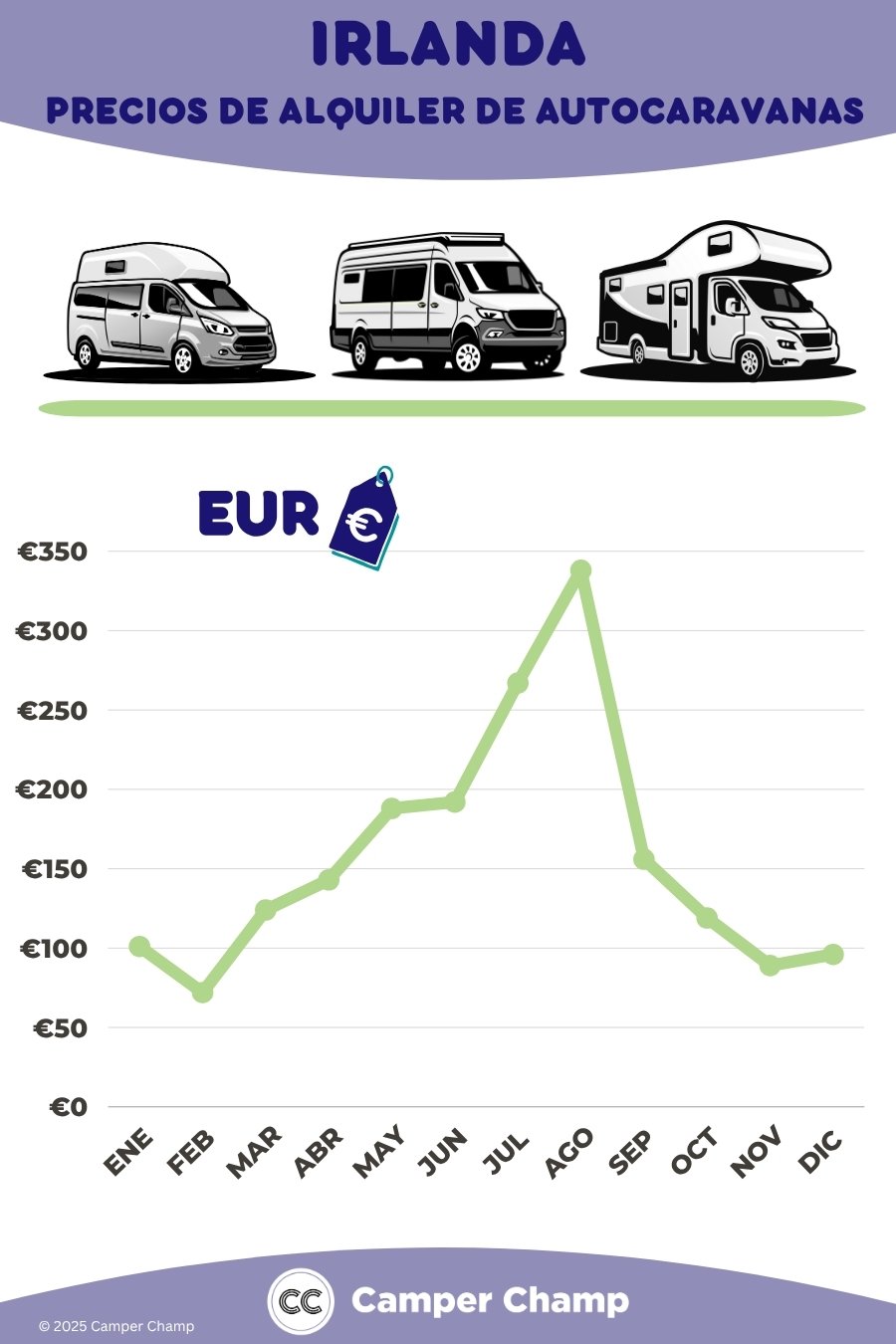 Los precios de las autocaravanas de alquiler en Irlanda oscilan entre los 80-170 €/día o más, dependiendo del tamaño y prestaciones del vehículo. Entre las marcas más populares se incluyen Causeway Campers, Bunk Campers, Anywhere Campers, McRent y Black Sheep.