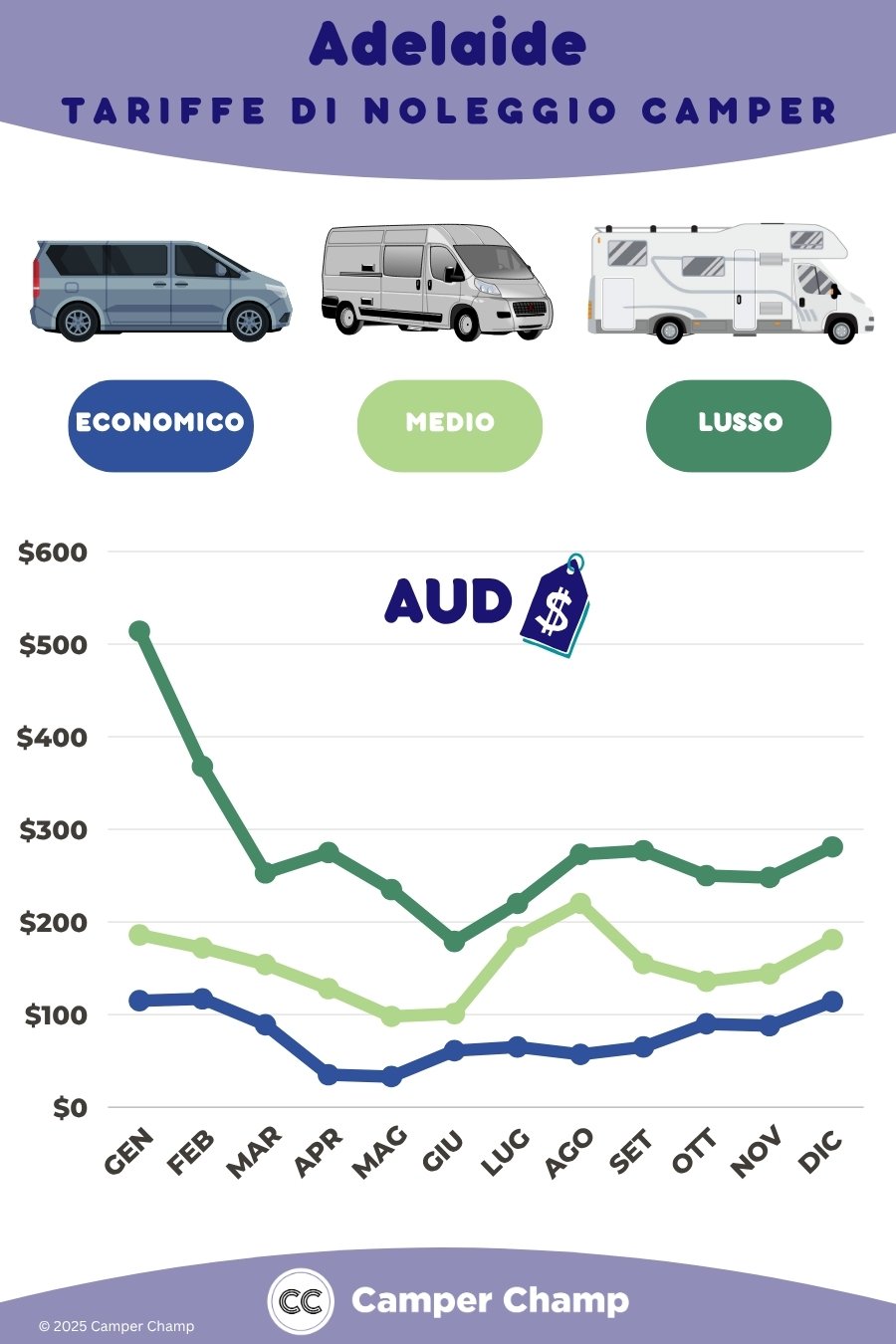 Il costo giornaliero di un camper a Adelaide varia generalmente tra i 60$ e i 500$ al giorno. Le tariffe variano a seconda della domanda, della durata del noleggio e del modello di camper. I veicoli a disposizione spaziano dai modelli più economici come il Jucy Crib ai camper integrali più spaziosi come il Mighty Big Six.