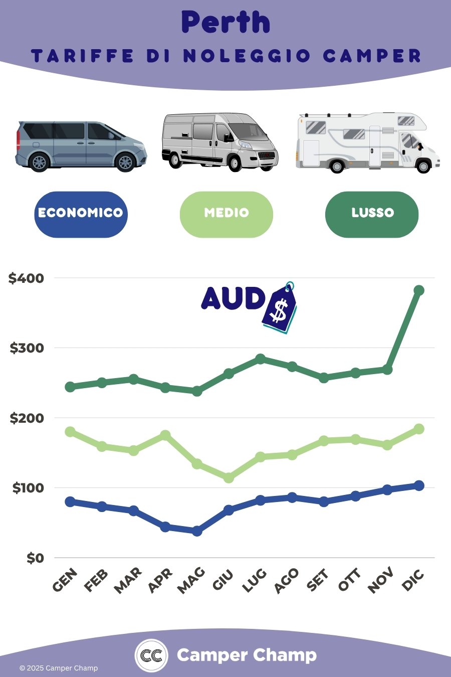 Le tariffe di noleggio a Perth oscillano generalmente tra i 45$ e i 380$ al giorno, coi prezzi che variano in base alla stagione, alla durata del noleggio e al tipo di camper. L'offerta in Australia Occidentale è variegata, con veicoli che vanno dai camper più economici come il Travellers Autobarn Station Wagon, alle soluzioni più spaziose come il Maui Ultima Plus Elite.