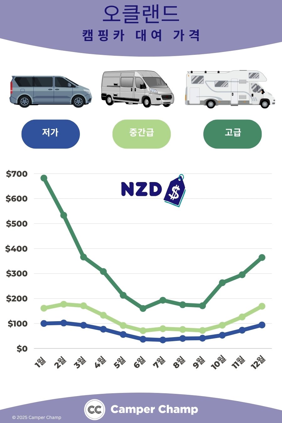오클랜드에서 캠핑카를 렌트하는 가격은Jucy Crib과 같은 소형 차량의 경우 하루 약 $50에서 시작하여, Discover NZ 6 Berth Imala와 같은 큰 모델의 경우 하루 최대 $550까지 올라갈 수 있습니다. 계절에 따라 가격은 변동됩니다. 가장 비싼 시기는 12월과 1월이며 겨울 시즌에는 비용이 상대적으로 낮아집니다.