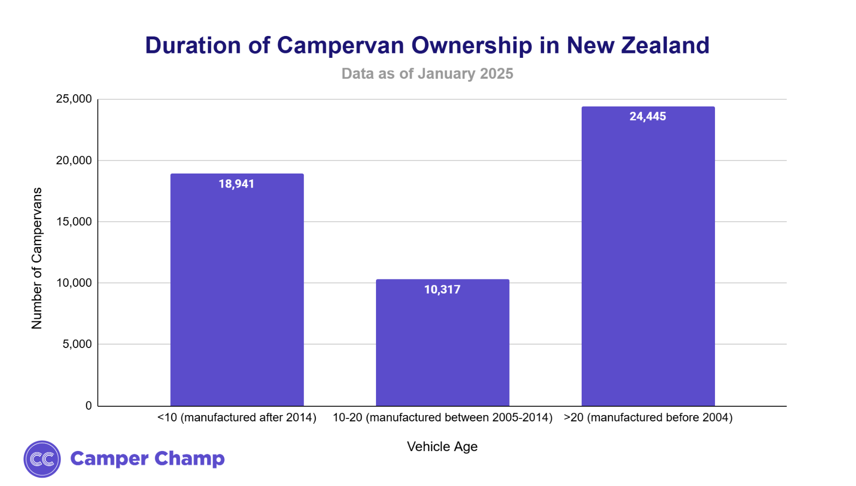 - 24,445 campervans were more than 20 years old (manufactured before 2004), 10,317 were 10-20 years old (manufactured between 2005-2014) and 18,941 were less than 10 years old (manufactured after 2014) according to manufacture year data of January 2025.