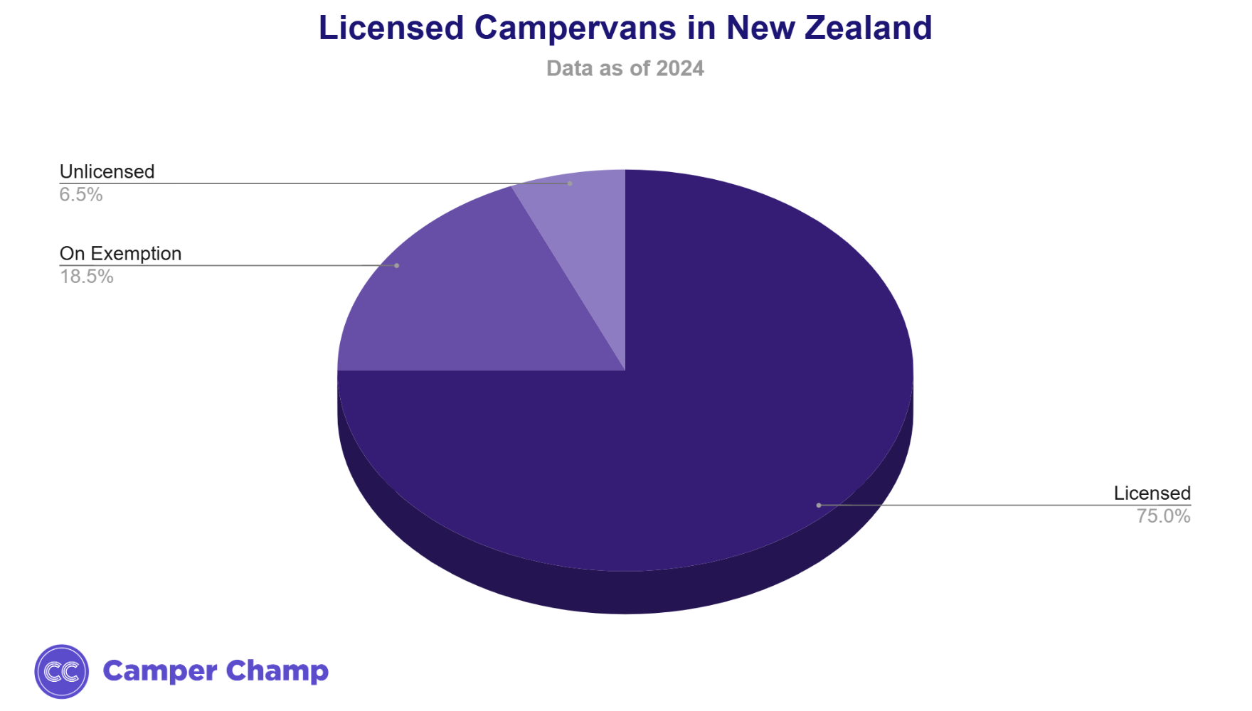 - 40,305 campervans (75%) were licensed, 9,855 campervans (18.5%) were on exemption and 3,476 campervans (6.5%) were unlicensed out of the total of 53,636 campervans in New Zealand.