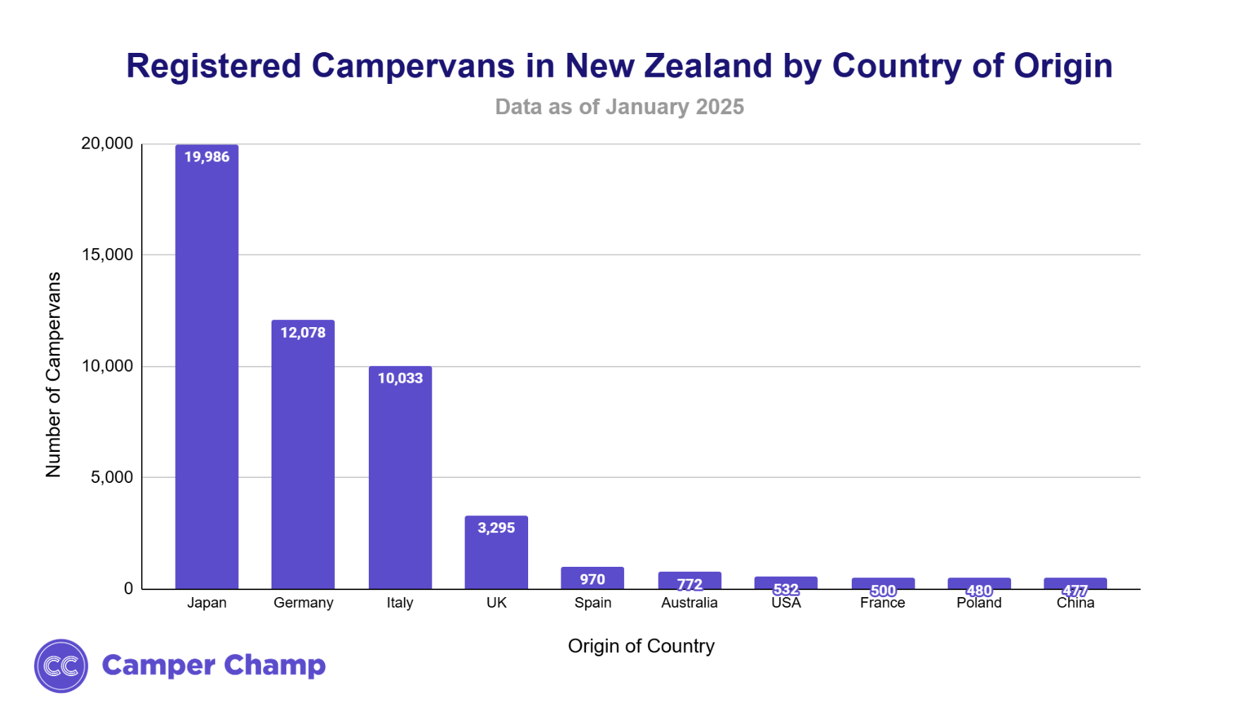 - Most campervans on the road originate from Japan (19,986 vehicles), followed by Germany (12,078 vehicles) and Italy (10,033 vehicles). These three make up the majority of campervan origins, indicating a strong dominance of European and Japanese manufacturers in the market.