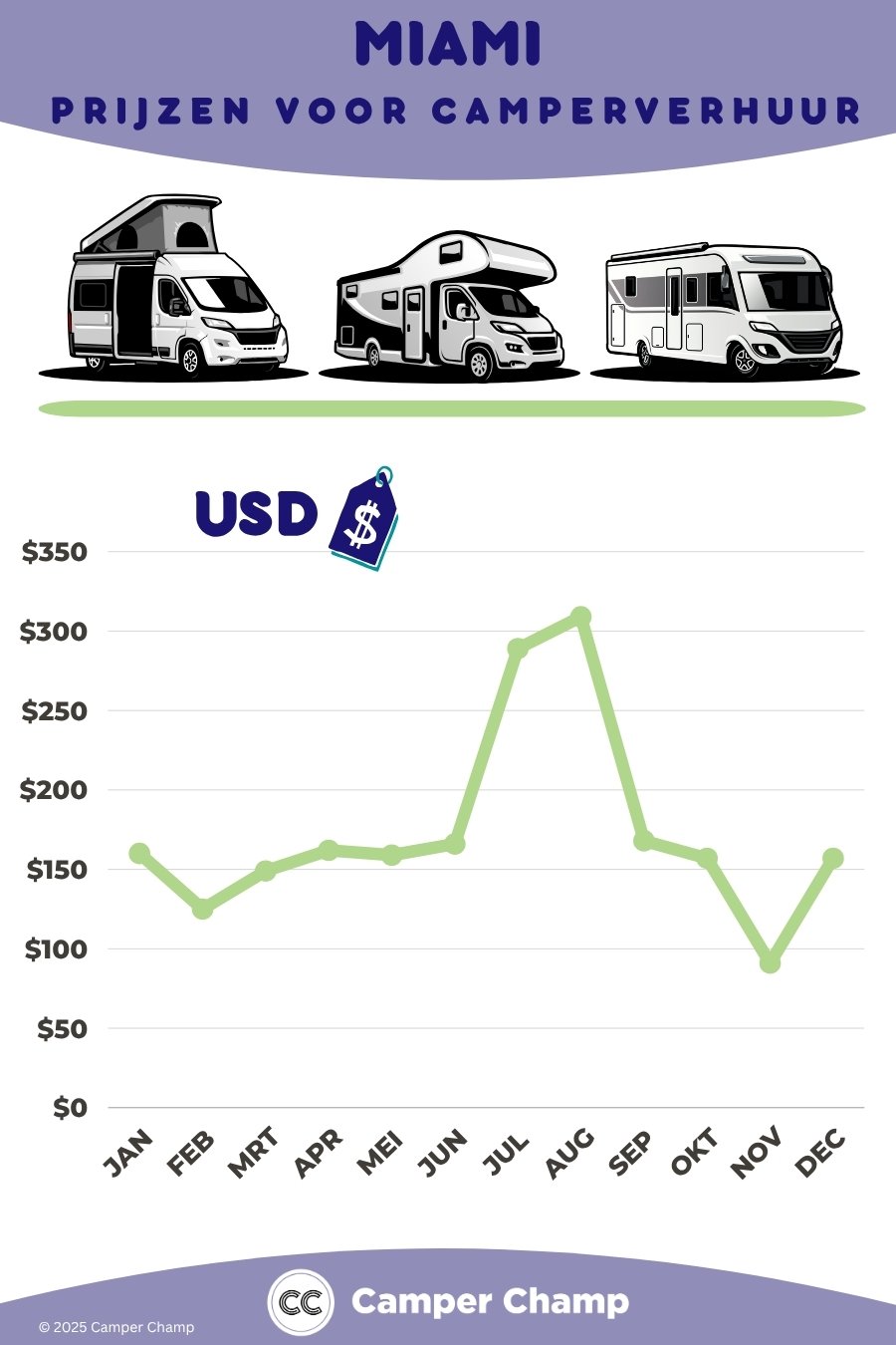De huurprijzen voor campers in Miami variëren tussen de $150-$275/dag voor de meeste voertuigen. Populaire voertuigen zijn onder andere de Cruise America C19 en de El Monte Class A Family Sleeper.