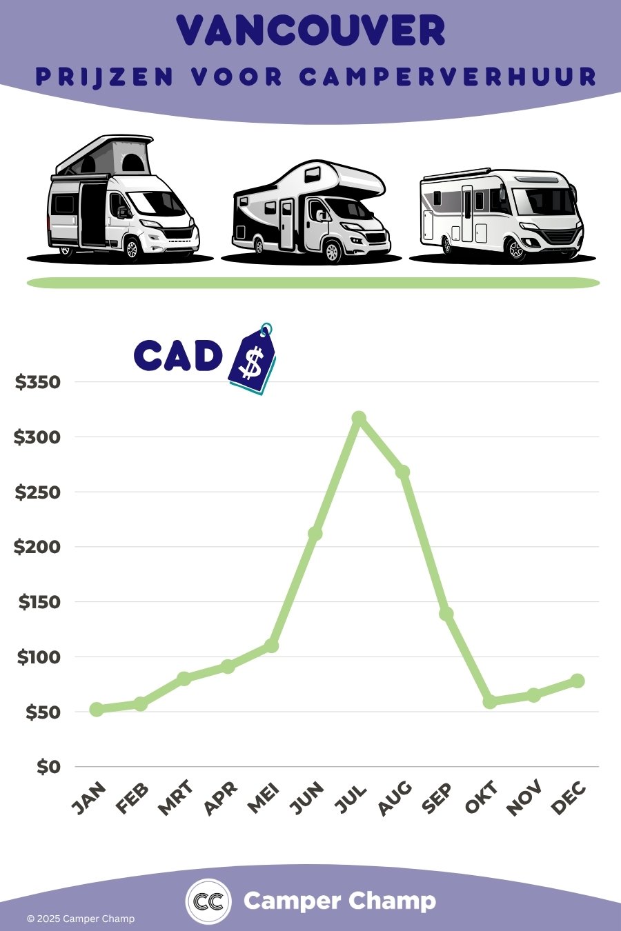 De kosten voor het huren van een camper in Vancouver beginnen bij ongeveer $55/dag voor kleine voertuigen en kunnen oplopen tot $450/dag of meer voor grotere en premium campers. Populaire keuzes zijn onder andere Cruise Canada Klasse C RV's zoals C21 of C25, en campers van Meridian, Outdoor Travel en Canadream.