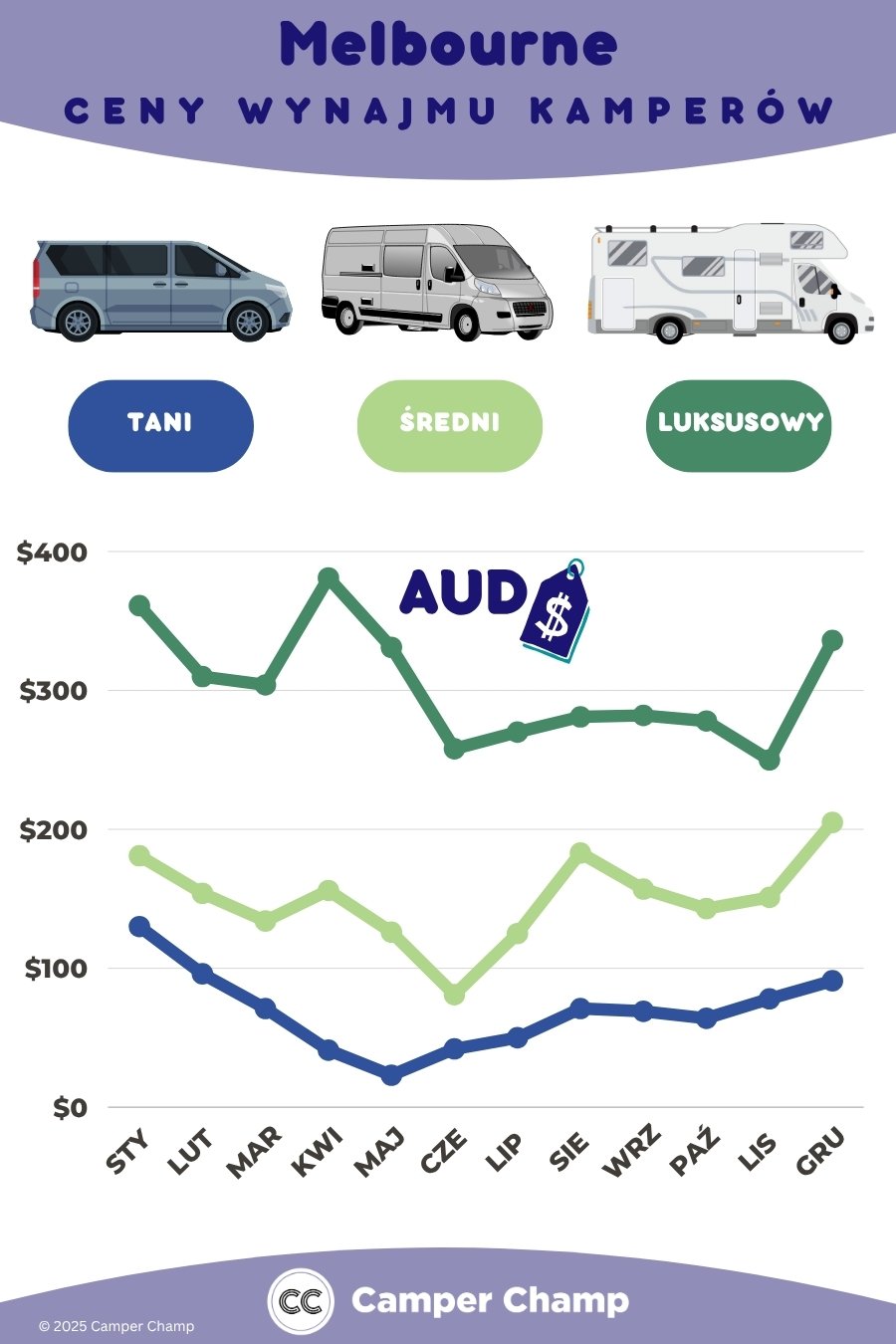 Ceny za wynajem kampera w Melbourne wahają się zwykle od $40 do $380 za dzień. Koszty różnią się w zależności od dostępności, długości rezerwacji i typu kampera. W ofercie znajduje się szeroka gama pojazdów - od mniejszych kamperów, takich jak Calypso Sturt, po większe, takie jak Maui River Elite.