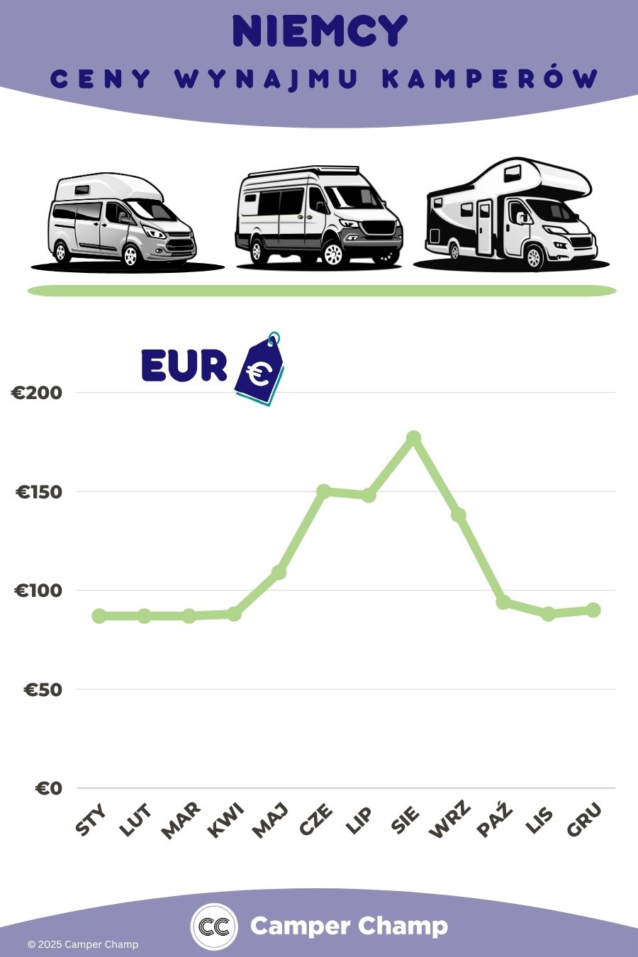 Średni koszt wynajmu kampera w Niemczech zaczyna się od około €80/dzień i może wzrosnąć do €280/dzień lub więcej w zależności od typu pojazdu, wielkości, sezonowości i innych czynników.