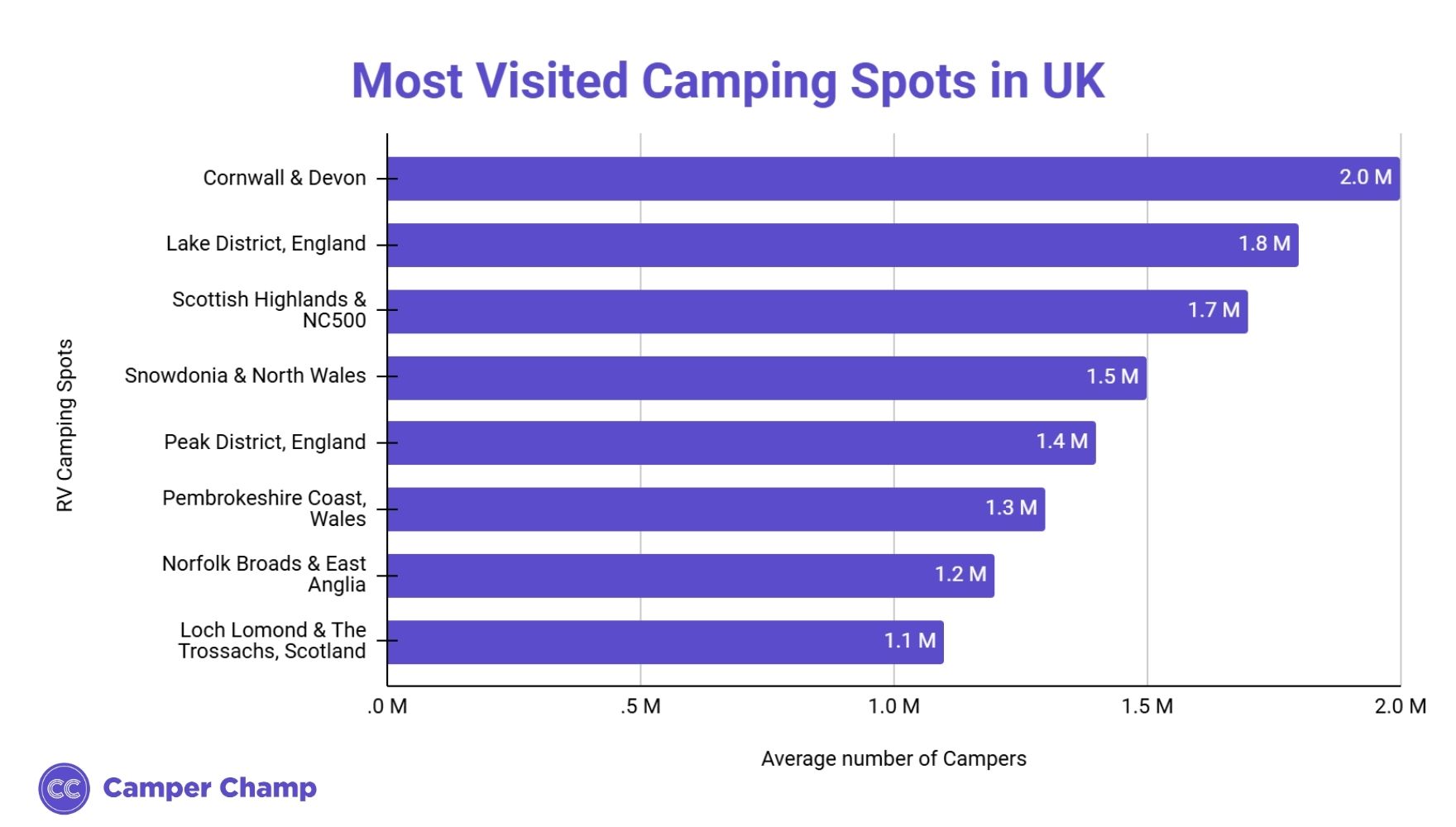 - The Scottish Highlands & NC500 are famous for their driving routes and wild camping, getting 1.7 million campers.