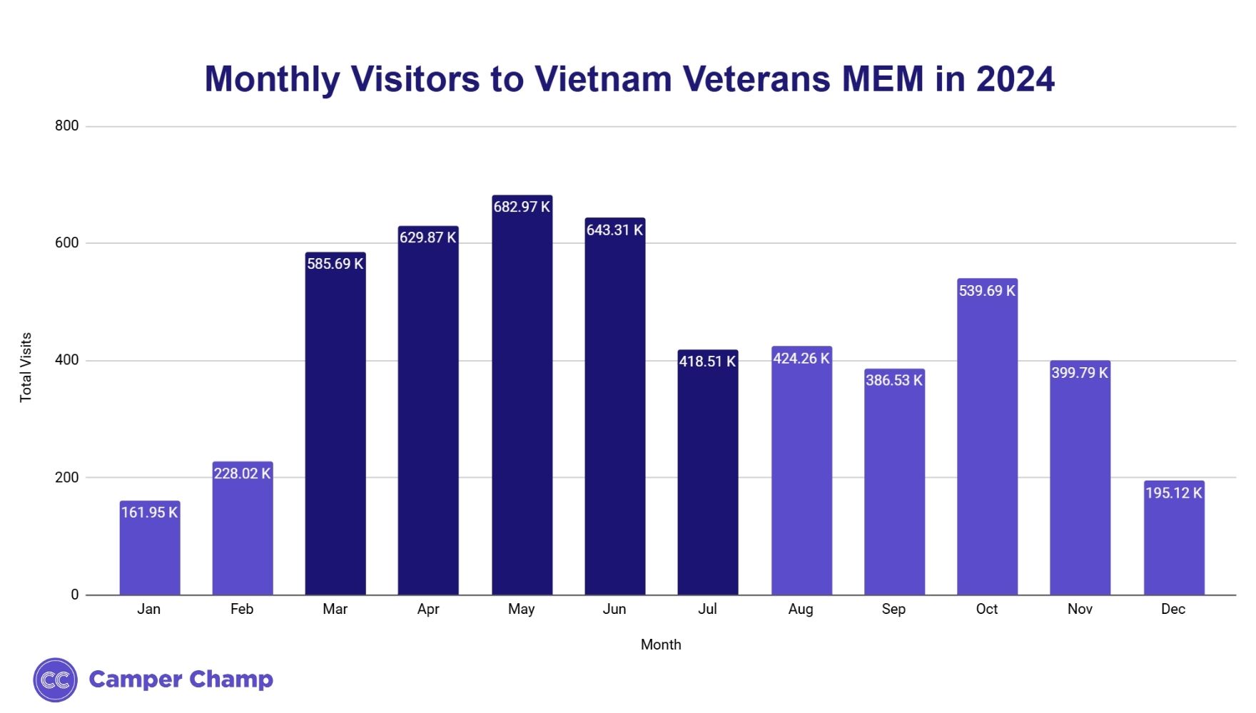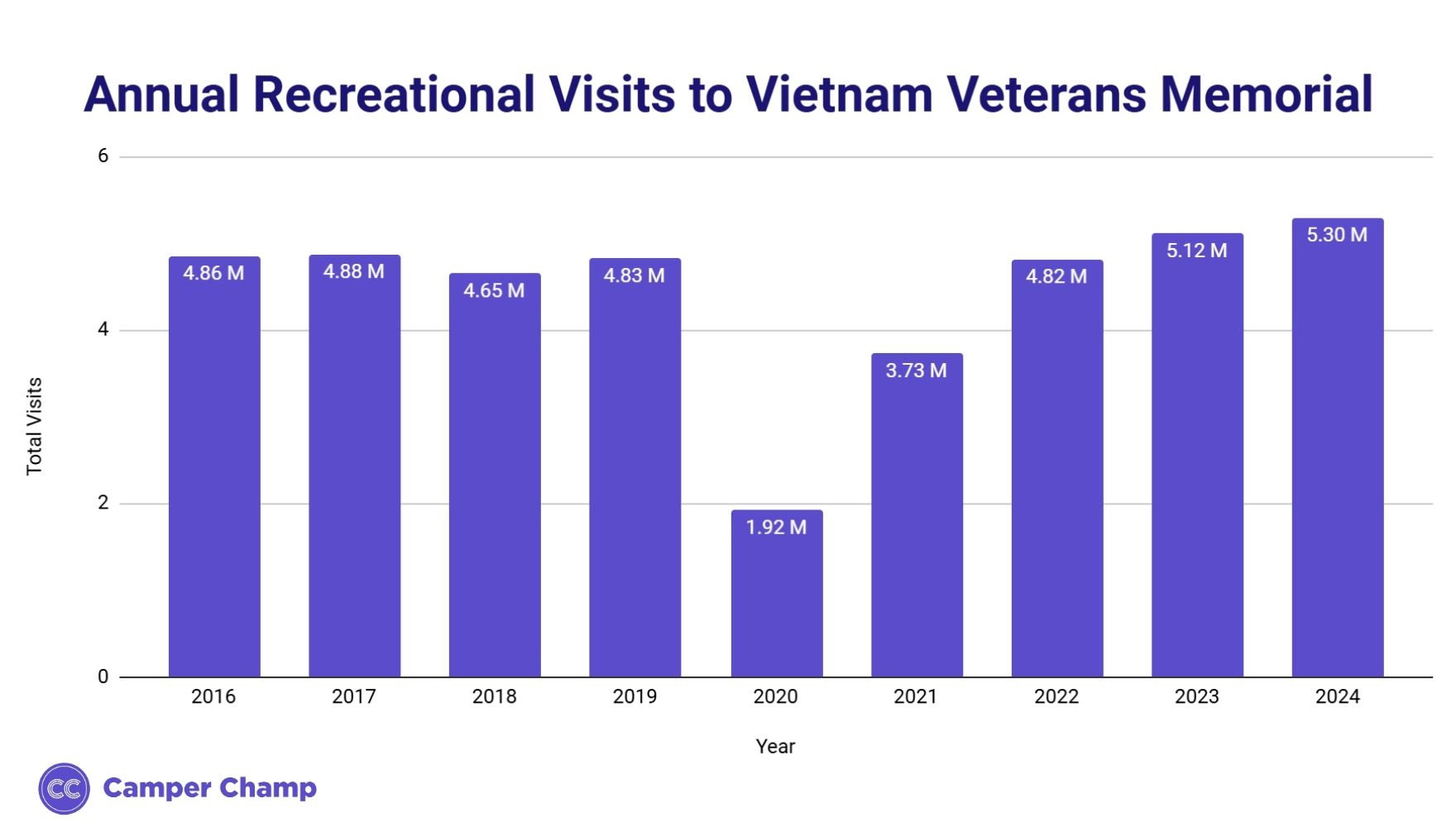 - A total of 5,295,711 people visited the Vietnam Veterans Memorial in 2024, a 5.1% increase from the previous year.