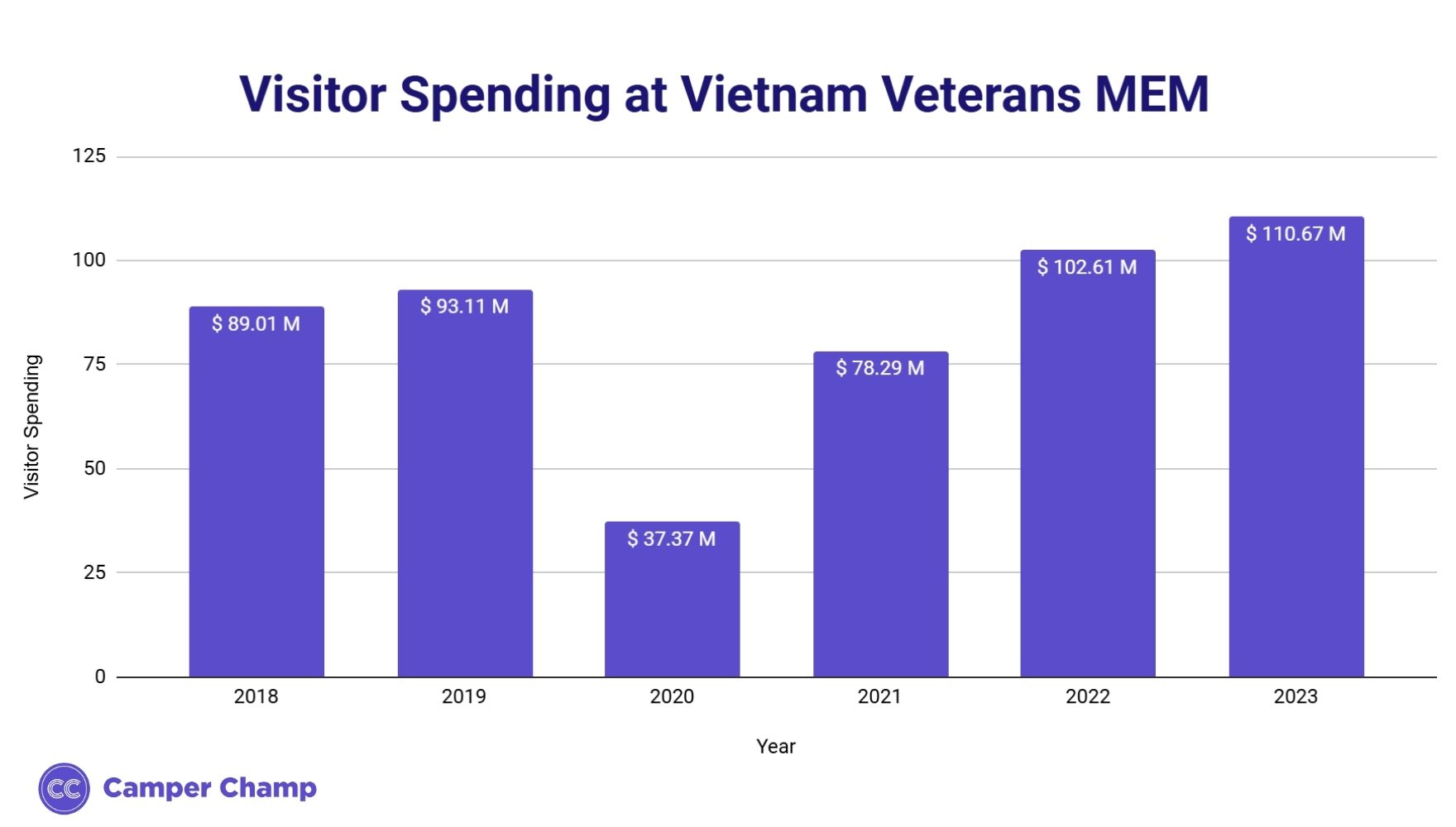 - In 2023, visitor spending at the memorial reached $110.67 million, a 7.9% increase from 2022 ($102.61 million).